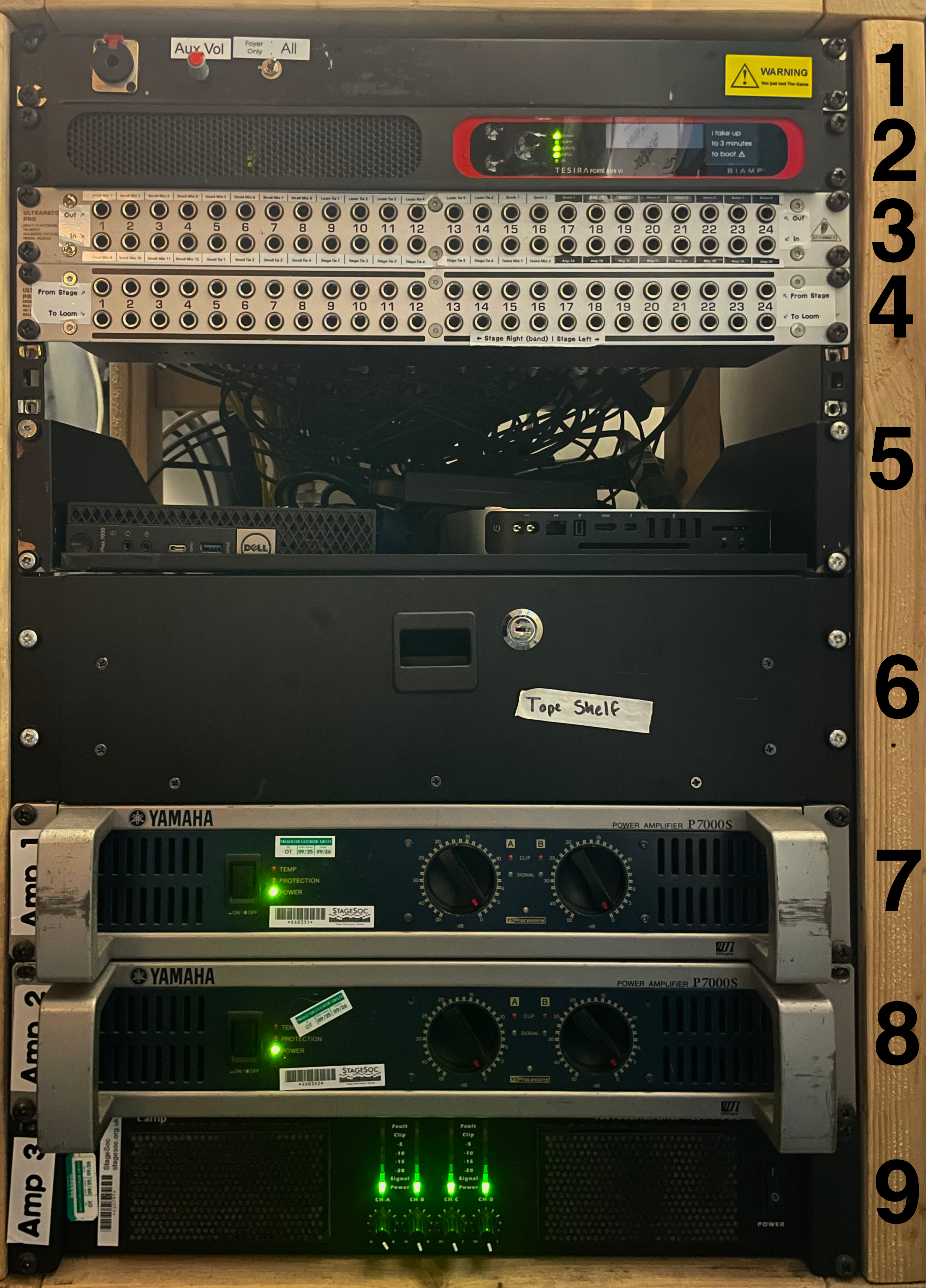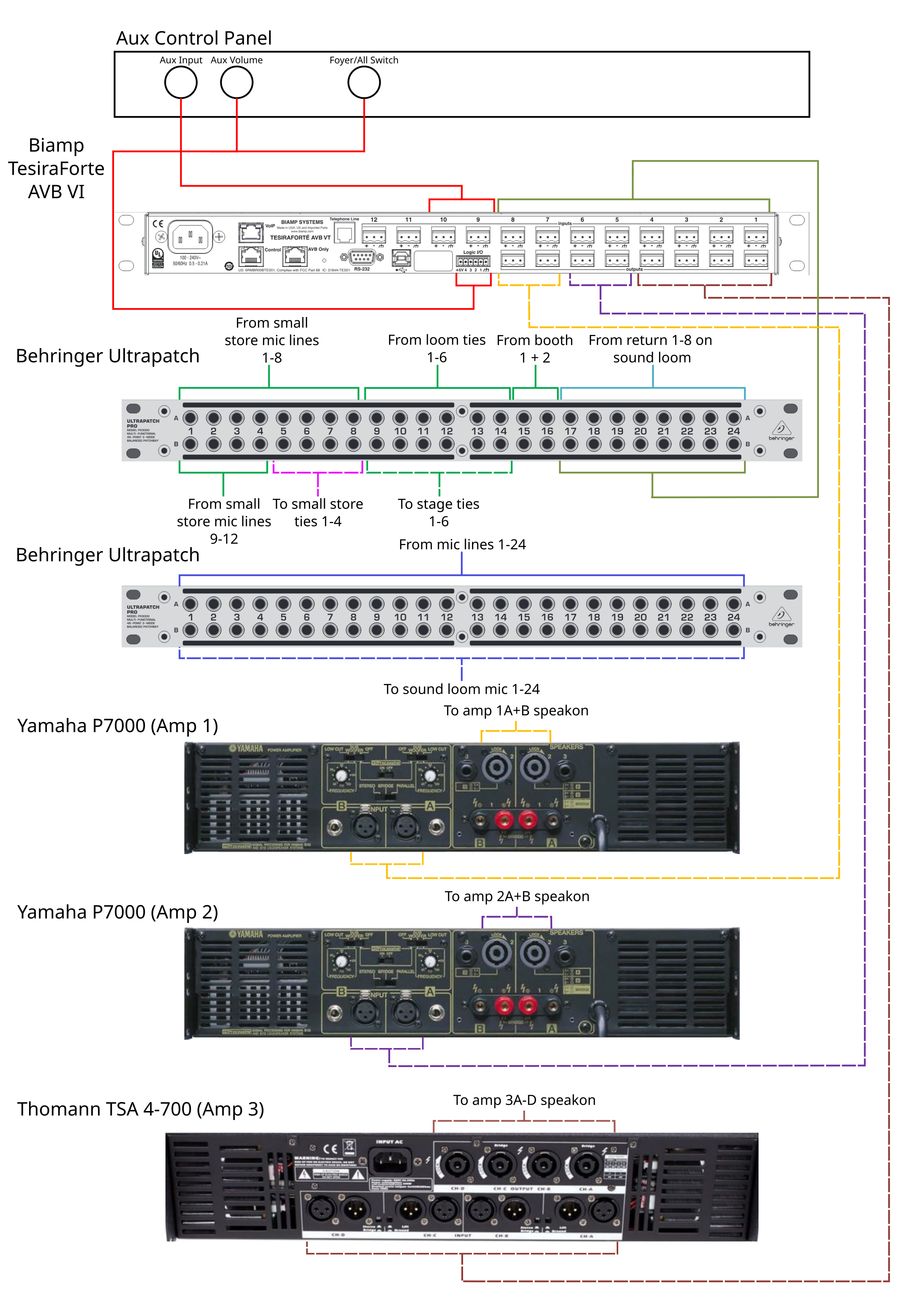 - Amps go through Tesira after this patch panel and before the amps.