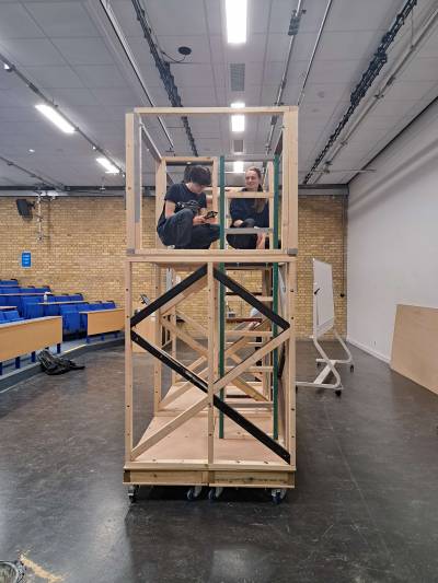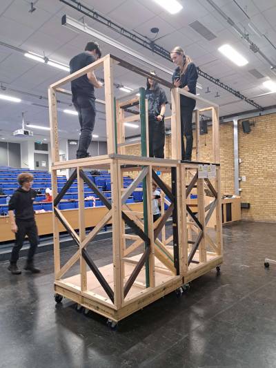 The towers were built in January 2023, to be first used in The Addams Family. They were designed by Jonathan Ferguson and built by him and a team of dedicated crew over the period of two full days and one evening. The total cost was significant (>£300), which was paid for by StageSoc as the towers will be an asset used for many shows to come (hopefully!).