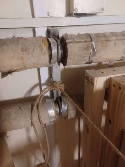 The flat pack parts are kept in lift store. Take care when lifting these into/out of lift store as falling parts could be very dangerous. Hard hats and good communication are essential. Ensure the parts are securely tied to strong points (e.g. the heating pipe wall clamps, not the pipes themselves) before leaving unattended, so they cannot fall out of lift store.