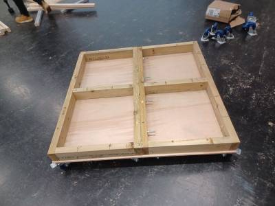 The 2'x4' wheeled base pieces are currently stored in Big Store and are used as wheely trollies. You can stack one on top of another if you apply both brakes on the top one!